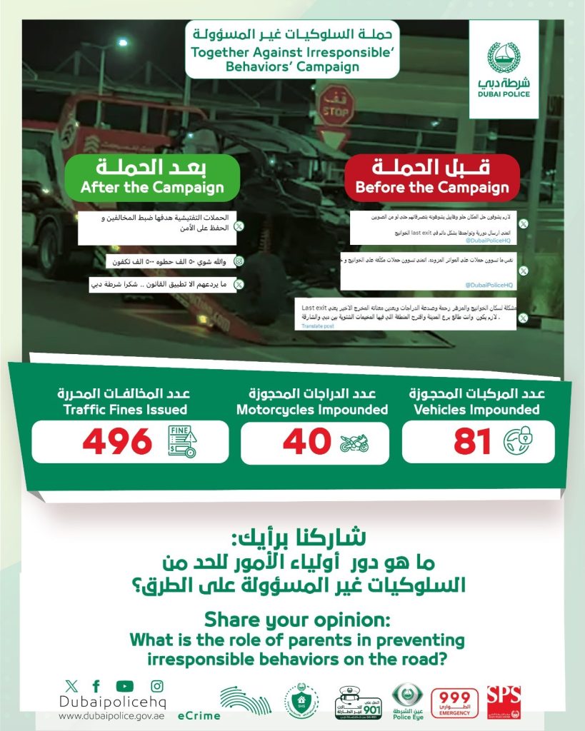 وأوضح  قلة الوعي لدى بعض الآباء تدفع الأبناء إلى ارتكاب كثيراً من المخالفات التي تشكل خطراً على حياتهم حال تعرضهم لحوادث بليغة، مناشداً أفراد المجتمع الإبلاغ عن تلك الممارسات عبر خدمة “عين الشرطة” في تطبيق شرطة دبي على الهواتف الذكية، أو الاتصال على الرقم 901