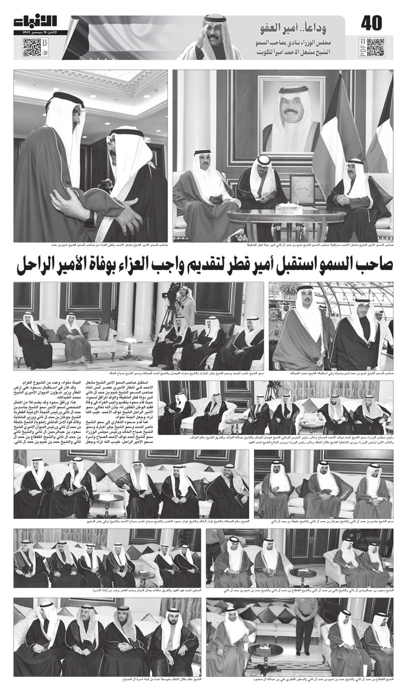 كما قدم سموه التعازي إلى سمو الشيخ ناصر المحمد وسمو الشيخ جابر المبارك وسمو الشيخ صباح الخالد ورئيس مجلس الوزراء سمو الشيخ أحمد نواف الأحمد الصباح وأسرة سمو الأمير الراحل، طيب الله ثراه وجعل الجنة مثواه، وعدد من الشيوخ الكرام.