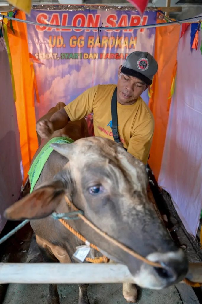 ويُفترض أن تكون البقرة البالغة عامين في أفضل حالاتها لبيعها كأضحية في عيد الأضحى. ويشير سوماروان إلى أنه واحد من شخصين فقط يمارسان تدليك الأبقار، في منطقة تقع شمال جاكرتا. وتبدو اللكمات التي يوجهها للحيوان عنيفة، لكنّ البقرة تثق به، على حد قوله.