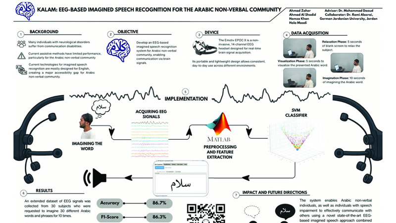 ويلتقط تطبيق كلام (KALAM) إشارات الدماغ عبر سماعة رأس لتخطيط كهربية الدماغ (EEG) عندما يتخيل الشخص كلمات عربية محددة، تُنقّى هذه الإشارات الخام أولاً لإزالة التشويش، ثم تُعالَج لاستخلاص أنماط رئيسة في كيفية استجابة الدماغ، ثم يصنّفها النظام للتعرف عليها ومطابقتها مع مكتبة تضم 30 كلمة مُدرَّبة، وبمجرد العثور على تطابق، تُعرَض الكلمة كنص أو تُنطق بصوت عالٍ من خلال التطبيق، ويتم جميع عمليات المعالجة آنياً، ما يسمح بالتواصل السريع دون أي حركة جسدية بمجرد التفكير في الكلمة. وأوضح الباحثان أن نظام «كلام» يتميز بتركيزه على الكلام المُتخيل باللغة العربية، وهي لغة غالباً ما تُغفل في أبحاث واجهة الدماغ والحاسوب، حيث تستهدف معظم الأنظمة الحالية اللغة الإنجليزية، بخلاف العديد من الأدوات المساعدة التي تعتمد على تتبع العين، أو المفاتيح المادية، أو لوحات الرموز المحدودة، إلا أن «كلام» يتيح للمستخدمين التواصل من خلال التفكير فقط، دون أي حركة.