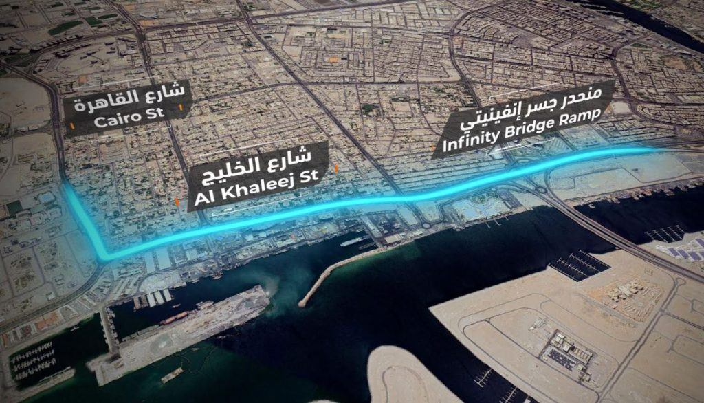 وأضاف: يشمل المشروع الذي يعد جزءاً من المرحلة الرابعة، تنفيذ نفق شارع الخليج بسعة ثلاثة مسارات في كل اتجاه بطول 1650 متراً، لتوفير حركة مرورية حرة وانسيابية للقادمين من جسر (إنفينيتي) باتجاه ديرة والعكس، كما يشمل تطوير تقاطع شارعي القاهرة – الوحيدة من دوارات إلى تقاطعات محكومة بإشارات ضوئية، وكذلك تنفيذ بعض التحسينات على شارع القاهرة، وربط منحدر الجسر القادم من جزر دبي إلى النفق الجديد على شارع الخليج باتجاه الشمال، مشيراً إلى أن هذه المرحلة من المشروع تخدم مناطق أبو هيل، والوحيدة، والممزر، إضافة إلـى المشاريع التطويرية وهي: جزر دبي، وواجهة دبـي البحرية، وسوق الواجهة البحرية، وميناء الحمرية.