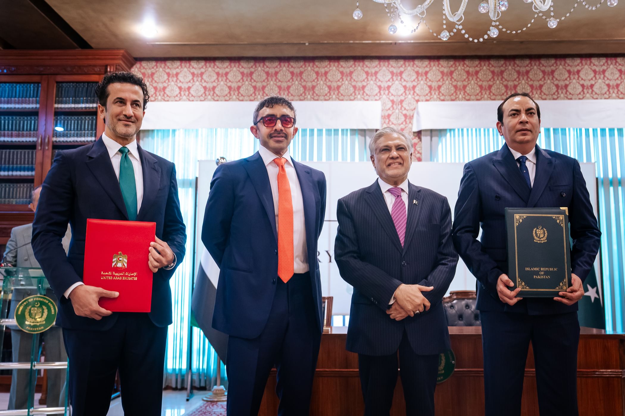 ووقع سمو الشيخ عبدالله بن زايد آل نهيان ومحمد إسحاق دار على مذكرة تفاهم بشأن إنشاء لجنة مشتركة للشؤون القنصلية بين البلدين.