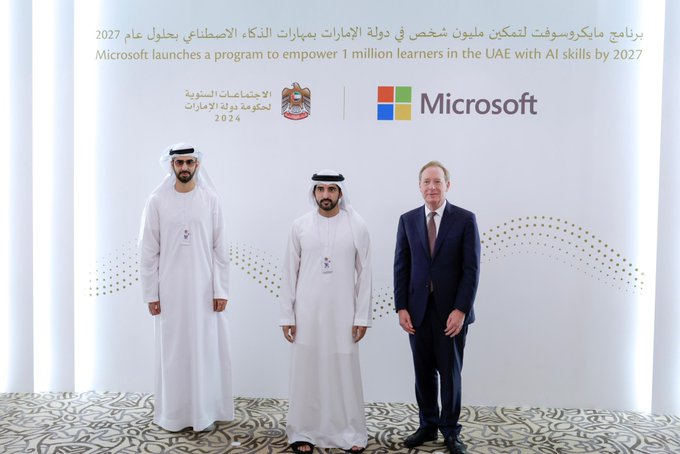 التقى سمو الشيخ حمدان بن محمد بن راشد آل مكتوم، ولي عهد دبي نائب رئيس مجلس الوزراء وزير الدفاع، خلال الاجتماعات السنوية لحكومة دولة الإمارات 2024، ،نائب رئيس مجلس الإدارة رئيس مايكروسوفت براد سميث، وأعلنا عن شراكة لإطلاق مبادرة تهدف إلى تأهيل مليون شخص بمهارات الذكاء الاصطناعي في الإمارات بحلول 2031.