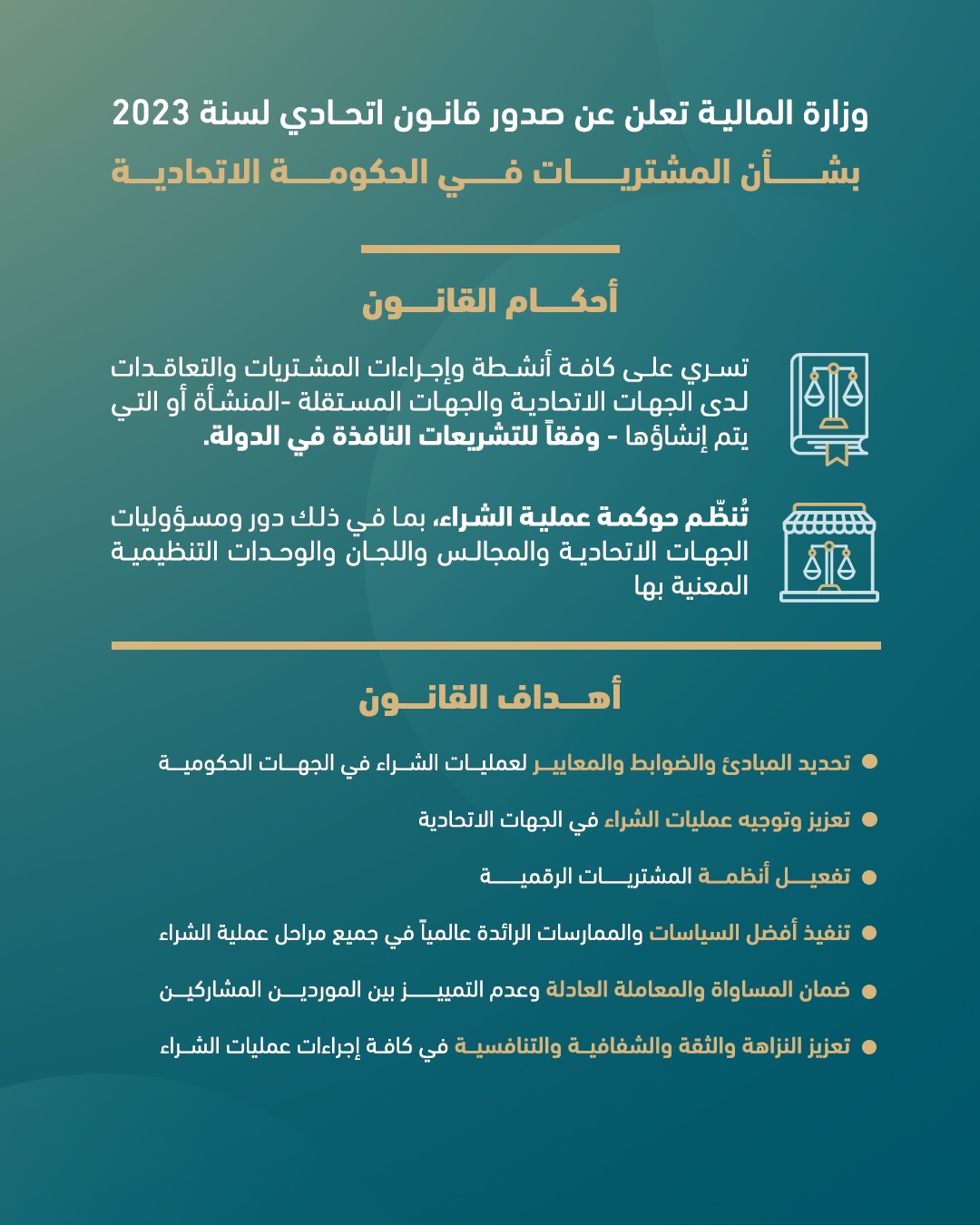 أعلنت وزارة المالية عن صدور قانون اتحادي رقم (11) لسنة 2023 بشأن المشتريات في الحكومة الاتحادية. يستند القانون إلى أفضل الممارسات الدولية المتقدمة والمرنة، وينظم الإطار العام للمشتريات في حكومة دولة الإمارات، حيث دخل حيز التنفيذ من 01 ديسمبر 2023.