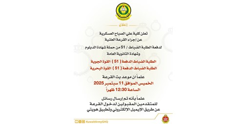 أعلنت كلية علي الصباح العسكرية عن اجراء القرعة العلنية لدفعة الطلبة الضباط (51) من حملة شهادة الدبلوم وشهادة الثانوية العامة