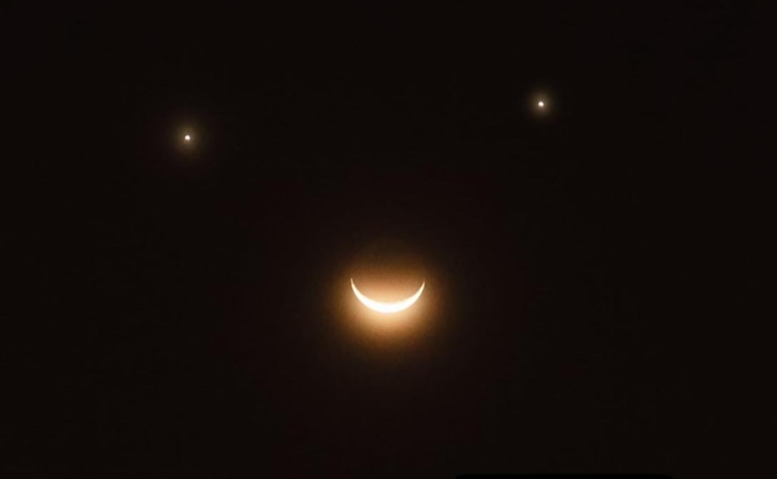 وقال الجروان لـ “الإمارات اليوم”، أنه ابتداءا من الساعة 09:00 صباحا بتوقيت الإمارات ستكون المنظومة وجها باسما عيناه كوكب الزهرة و زحل و فمه الهلال في مشهد جميل يشاهد بالعين المجردة وستشهد بهذه الصورة فقط في أقصى غرب أوروبا و أفريقيا وفي الأميركيتين قبل أن يبتعد الهلال أكثر عن الكوكبين النيرين ، وبالتالي لن يشاهد منظر الوجه المبتسم لمنظومة الكواكب في منطقة الخليج العربي و الجزيرة العربية.