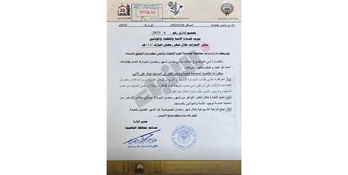 وأكد التعميم : منع الإجازة خلال العشر الأواخر من شهر رمضان المبارك لما في العشر الأواخر من الحاجة الماسة لوجود الأئمة والمؤذنين بالمساجد ومنع الراحة الأسبوعية خلال شهر رمضان لخصوصية هذا الشهر الفضيل بالعبادة.