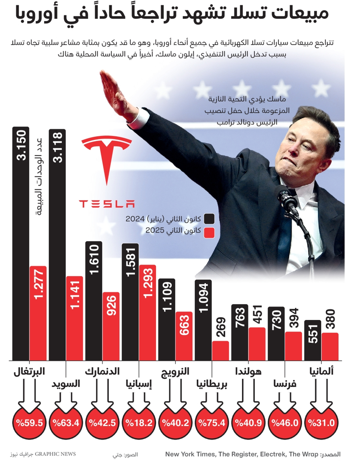 تتراجع مبيعات سيارات تسلا الكهربائية في جميع أنحاء أوروبا، وهو ما قد يكون بمثابة مشاعر سلبية تجاه تسلا بسبب تدخل الرئيس التنفيذي، إيلون ماسك، أخيراً في السياسة المحلية هناك