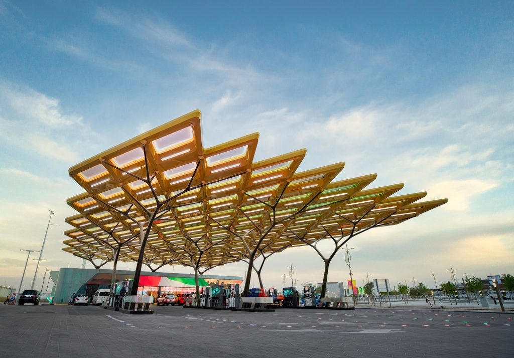 أنشئت محطة الخدمة المستقبلية في موقع إكسبو دبي 2020 للدفع قدماً بمفهوم الاستدامة، واعتمد انشاؤها مبادئ المحاكاة الحيوية وتصميم وإنتاج المواد التي تمت نمذجتها وفق مكوّنات بيولوجية. وقد حقّقت محطة اينوك المبتكرة انجازاً بارزاً تمثّل في كونها أول محطة خدمة في العالم تنال التصنيف البلاتيني في “ريادة تصميمات الطاقة والبيئة” (LEED)، وذلك تأكيداً على أدائها الفائق في معايير عدّة أهمّها توفير الطاقة والفعّالية في استهلاك الماء وتخفيض انبعاثات ثاني أوكسيد الكربون.