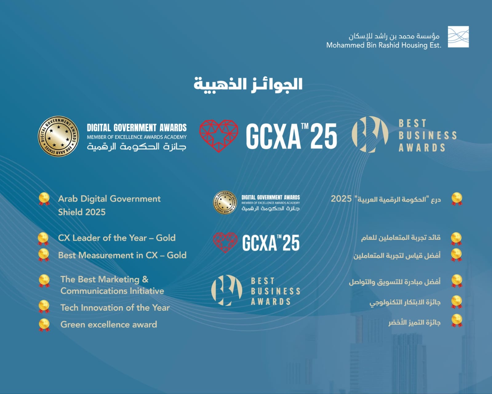 وقد تنوعت الجوائز التي حصدتها المؤسسة لتعكس شمولية تميزها المؤسسي، حيث نالت درع “الحكومة الرقمية العربية 2025 “من تنظيم “أكسلانس أواردز أكاديمي”، في فئة الإنجازات الحكومية تقديراً لريادتها في التحول الرقمي، إلى جانب جائزتين ذهبيتين ضمن “جوائز تجربة المتعاملين العالمية GCXA™25″، التي تنظمها “Awards International” ، وذلك عن فئتي “قائد تجربة المتعاملين للعام” و”أفضل قياس لتجربة المتعاملين”. كما أحرزت المؤسسة ثلاث جوائز ضمن “جوائز أفضل الأعمال لعام 2025″، شملت “جائزة التميز الأخضر” لجهودها في دمج ممارسات الاستدامة، و”جائزة أفضل مبادرة في الاتصال المؤسسي والتسويق” عن حملتها المجتمعية، و”جائزة الابتكار التكنولوجي” لتبنيها أحدث التقنيات في خدمات الإسكان.