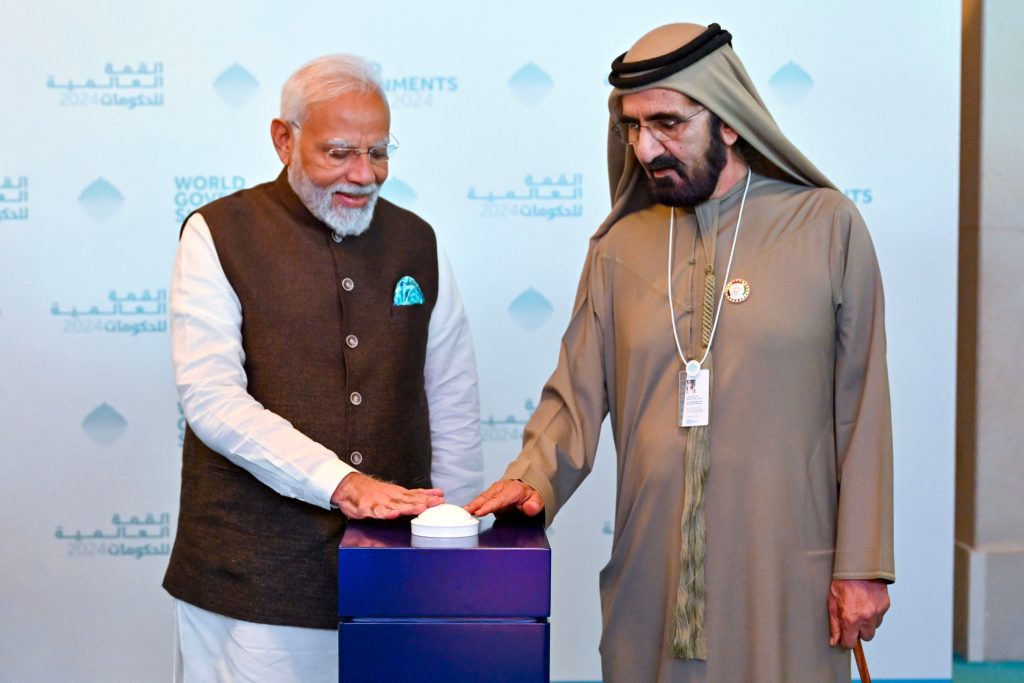 وضع صاحب السموّ الشيخ محمد بن راشد آل مكتوم، نائب رئيس الدولة رئيس مجلس الوزراء حاكم دبي، رعاه الله، يرافقه دولة ناريندرا مودي رئيس وزراء جمهورية الهند، ضيف شرف القمة العالمية للحكومات 2024، حجر الأساس لمشروع بوابة الهند التجارية “بهارات مارت”، والمقرر افتتاحه في دبي عام 2026، وذلك بحضور سمو الشيخ حمدان بن محمد بن راشد آل مكتوم، ولي عهد دبي رئيس المجلس التنفيذي لإمارة دبي.