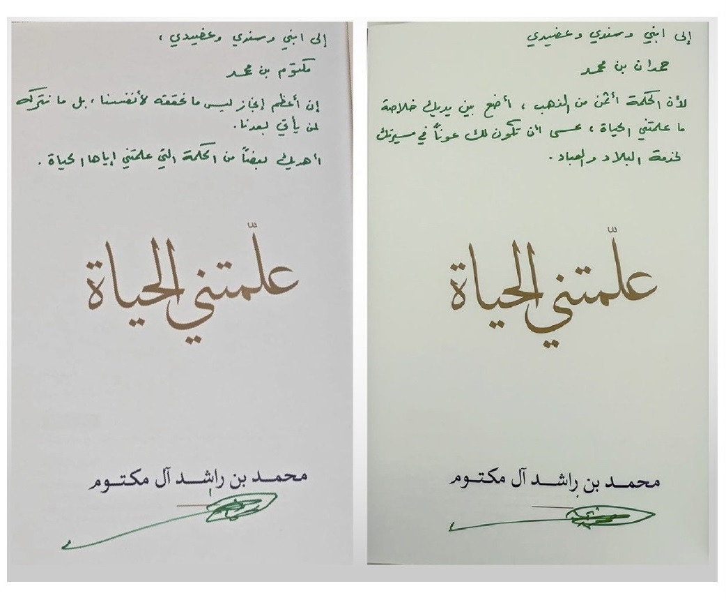 وأهدى سموه نسخة خاصة من كتاب «علمتني الحياة» الخاصة، بتوقيع سموه لسمو الشيخ حمدان بن محمد وكتب سموه بخط يده في الإهداء: «إلى ابني وسندي وعضيدي، حمدان بن محمد، لأن الحكمة أثمن من الذهب، أضع بين يديك خلاصة ما علمتني الحياة، عسى أن تكون لك عوناً في مسيرتك لخدمة البلاد والعباد».