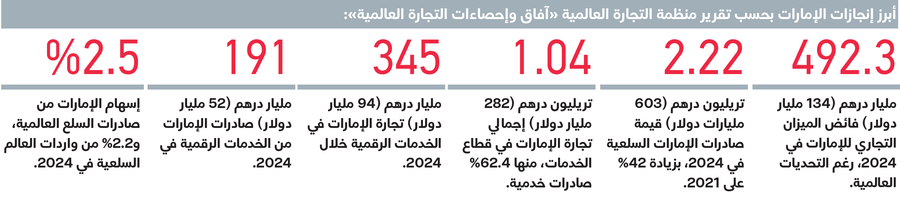 وأعلن صاحب السموّ الشيخ محمد بن راشد آل مكتوم، نائب رئيس الدولة رئيس مجلس الوزراء حاكم دبي، رعاه الله، أن إجمالي التجارة الإماراتية مع العالم بلغ 5.23 تريليونات درهم (1.424 تريليون دولار) في عام 2024، مقارنة بـ3.5 تريليونات درهم (949 مليار دولار) في عام 2021، محققة نمواً كبيراً يعكس رؤيتها الاقتصادية الطموحة، بحسب تقرير منظمة التجارة العالمية «آفاق وإحصاءات التجارة العالمية»، الذي أظهر الريادة المستمرة لدولة الإمارات واحدةً من أقوى الاقتصادات العالمية والإقليمية، وأسرعها نمواً في مجال التجارة الخارجية، حيث حققت الدولة إنجازات بارزة جعلتها في ريادة منطقة الشرق الأوسط وإفريقيا منذ عام 2014، ورسّخت مكانتها ضمن أفضل 20 مركزاً تجارياً عالمياً للسلع والخدمات.
