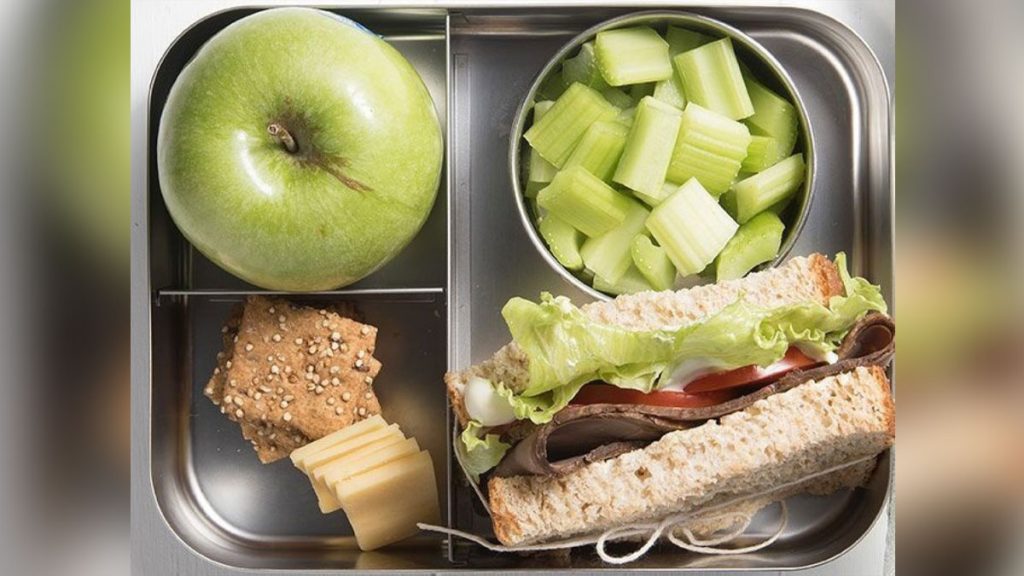 واقترحت أن تكون محتويات صندوق الطعام وجبة خفيفة، يتم تنويعها يومياً (شطيرة جبن، أو لبنة، أو مربى، أو زبدة الفول السوداني)، والاختيار يومياً بين نوع أو نوعين من الخضار (تفاح مقطع، وكمثرى مقطعة، وعنب، وفراولة، وتوت، وموز، وفواكه مجففة، وأصابع خيار، وجزر، وذرة مسلوقة)، فيما تكون المشروبات حليباً أو لبناً، أو حليباً بالنكهات، أو عصير فاكهة طبيعياً، وماء.