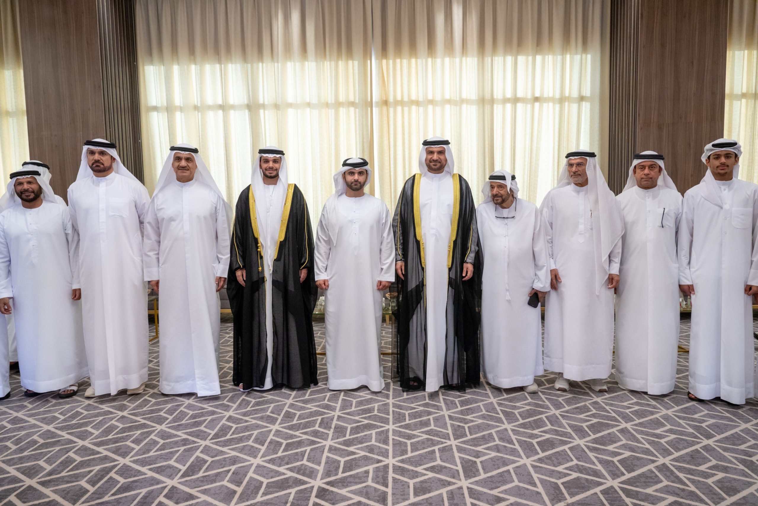 حضر سمو الشيخ منصور بن محمد بن راشد آل مكتوم، رئيس اللجنة الأولمبية الوطنية، حفل الاستقبال الذي أقامه د. عدنان عبد الكريم جلفار اليوم في مجلس أم سقيم بدبي، بمناسبة زفاف نجله حمد على كريمة خالد عيسى بو حميد.