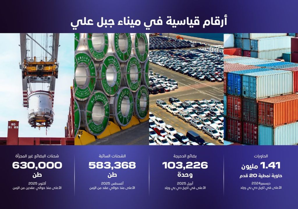 سجّل ميناء جبل علي، الميناء الرئيسي لمجموعة موانئ دبي العالمية “دي بي ورلد”، أداءً استثنائياً في أكتوبر 2025، بعدما حقق رقمًا قياسيًا في مناولة الشحنات السائبة بلغ 630 ألف طن، وهو أعلى إجمالي مناولة شهري يتم تسجيله منذ حوالي عقدين .