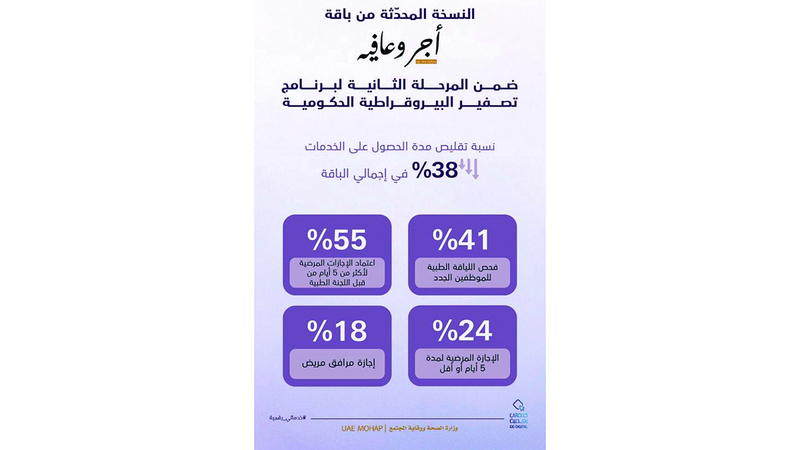 أطلقت وزارة الصحة ووقاية المجتمع بالتعاون مع الهيئة الاتحادية للموارد البشرية الحكومية ومؤسسة الإمارات للخدمات الصحية، النسخة المحدثة من باقة «أجر وعافية» المخصصة لموظفي الحكومة الاتحادية والمرشحين للعمل فيها، وذلك ضمن المرحلة الثانية من برنامج «تصفير البيروقراطية الحكومية» بهدف تبسيط الإجراءات وتسهيلها وتعزيز جودة حياة الموظفين وتحسين بيئة العمل الحكومية، ودعم استراتيجية القطاع الصحي في إرساء منظومة رعاية صحية رقمية ومرنة تعزز تنافسية الدولة.