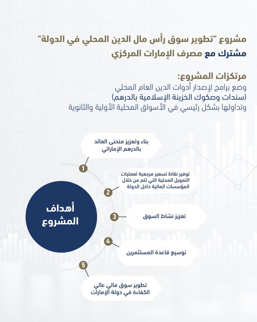 ومن بين هذه المشاريع التحولية التي تنفذها وزارة المالية مشروع “تطوير سوق رأس مال الدين المحلي في الدولة” وهو مشروع مشترك مع مصرف الإمارات المركزي، وذلك من خلال وضع برامج لإصدار أدوات الدين العام المحلي والتي تتمثل في سندات وصكوك الخزينة الإسلامية بالدرهم، وتداولها بشكل رئيسي في الأسواق المحلية الأولية والثانوية، بهدف بناء وتعزيز منحنى العائد بالدرهم الإماراتي وتوفير نقاط تسعير مرجعية لعمليات التمويل المحلية التي تتم من خلال المؤسسات المالية داخل الدولة، ما ينعكس على تعزيز نشاط السوق وتوسيع قاعدة المستثمرين وتطوير سوق مالي عالي الكفاءة في دولة الإمارات.