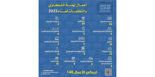 أصدر الديوان الوطني لحقوق الإنسان ممثلا باللجنة الدائمة للشكاوى والتظلمات التقرير الإحصائي لأعمال عام 2023 تضمن قيام اللجنة بـ 146 نشاطا في مختلف اختصاصاتها المنصوص عليها في قانون إنشاء الديوان رقم 67 لسنة 2015.