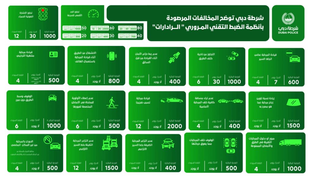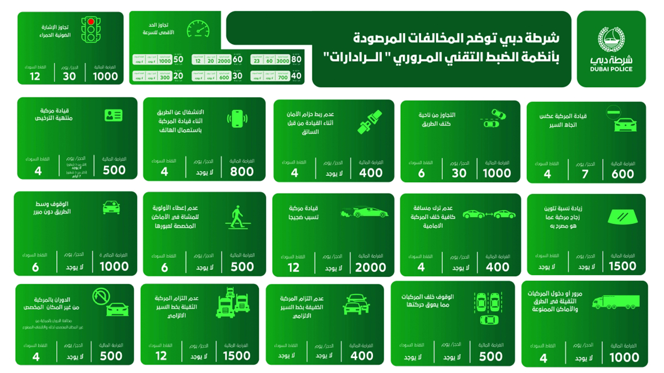 وقال مدير إدارة التقنيات المرورية في الإدارة العامة للمرور، العميد مهندس محمد علي كرم، في مؤتمر صحافي بحضور نائب مدير الإدارة العامة للمرور بالوكالة، العميد عصام إبراهيم العور، إن أبرز المخالفات التي تضبط مخالفة تجاوز الحد الأقصى للسرعة، وتبلغ غرامتها لمن تتجاوز سرعته 80 كم/ساعة فوق السرعة المقررة 3000 درهم، وحجز المركبة 60 يوماً، وتسجيل 23 نقطة سوداء للسائق، فيما تبلغ الغرامة المالية لتجاوز السرعة المحددة بما يزيد على 60 كم/ساعة 2000 درهم، وحجز المركبة 20 يوماً، و12 نقطة سوداء، في حين تبلغ قيمة الغرامة المالية بما يزيد على السرعة المحددة بـ50 كم/ساعة 1000 درهم، أما تجاوز السرعة بما يزيد على 40 كم/ساعة، فغرامته 700 درهم، وتجاوز السرعة 30 كم/ساعة 600 درهم، وما يزيد على 20 كم/ساعة 300 درهم.