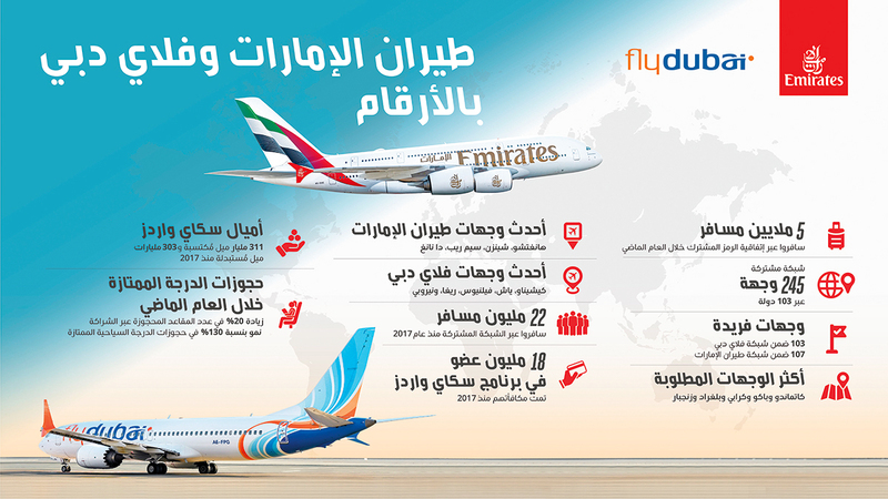 وسجلت الشراكة بين «طيران الإمارات» و«فلاي دبي» نمواً ملحوظاً في عدد المسافرين، إذ نقلت الناقلتان أكثر من خمسة ملايين مسافر عبر رحلات تبادل الرموز، خلال العام الماضي وحده، بنمو قدره 10% مقارنة بالعام السابق عليه، ومنذ عام 2017، استفاد أكثر من 22 مليون مسافر من الشبكة المشتركة.