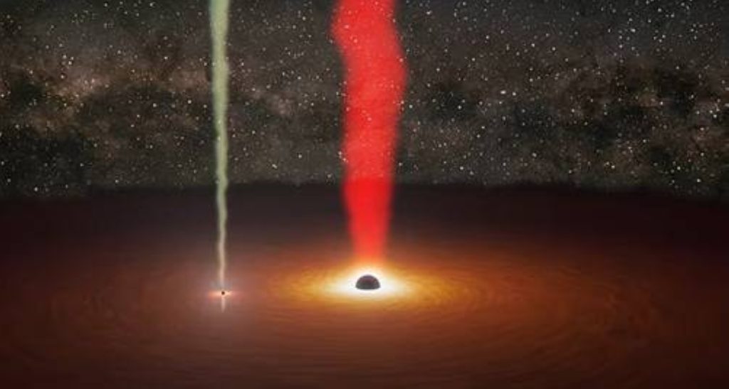 كما اكتشف الباحثون أن النفاثات الجزيئية الصادرة عن الثقب الأصغر تظهر «ملتوية»، مشابهة لتدفق المياه من خرطوم دوّار خارج عن السيطرة، بسبب السرعة العالية وحركته حول الثقب الأكبر.