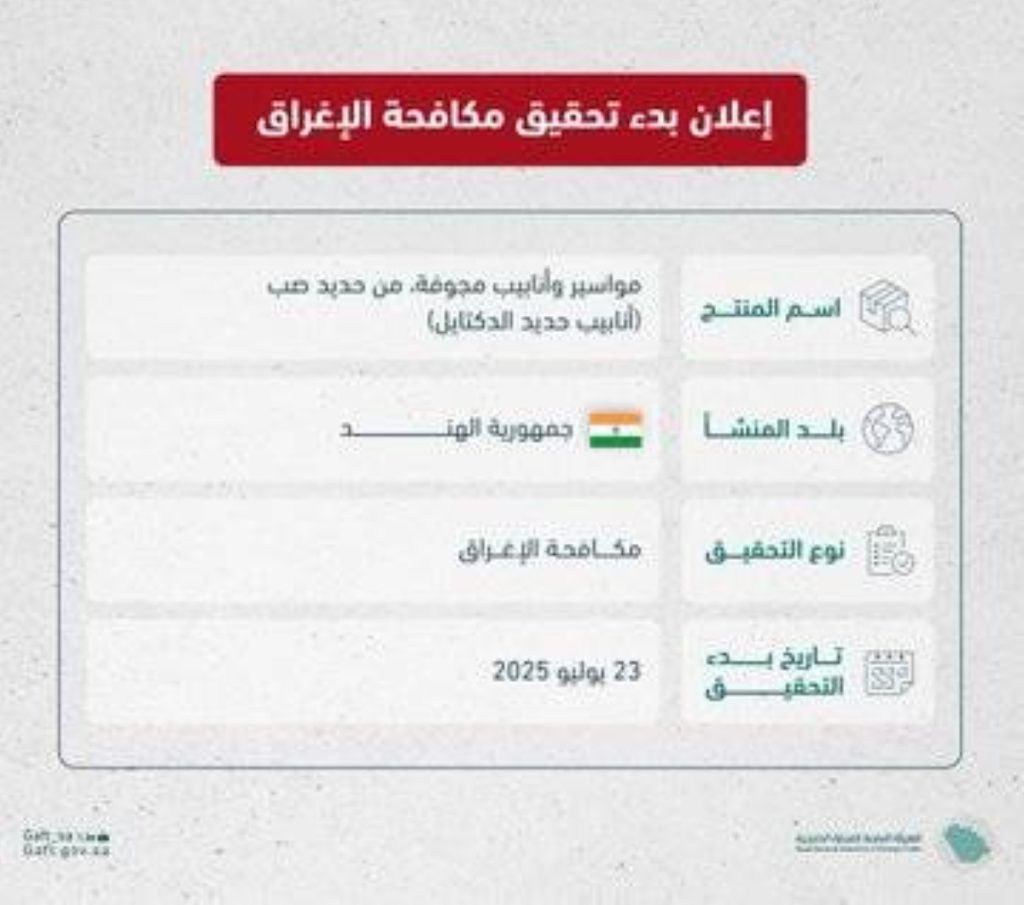 أعلنت الهيئة العامة للتجارة الخارجية بدء تحقيق مكافحة الإغراق ضد واردات المملكة من منتج مواسير وأنابيب مجوفة من حديد صب (أنابيب حديد الدكتايل) بأقطار من 100 ملم إلى 1000 ملم، وبالمواصفات الفنية K9 و C Class إلى C40 ذات منشأ أو المصدرة من جمهورية الهند.