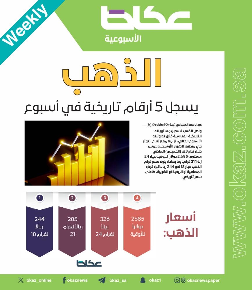 وسجل الذهب خلال تداولاته الأسبوع المنصرم 5 مستويات تاريخية أيام (الأحد، الإثنين، الثلاثاء، الأربعاء، الخميس) ليواصل يومياً تسجيل قمة تاريخية جديدة، دفعته لتسجيل أعلى مكاسب.