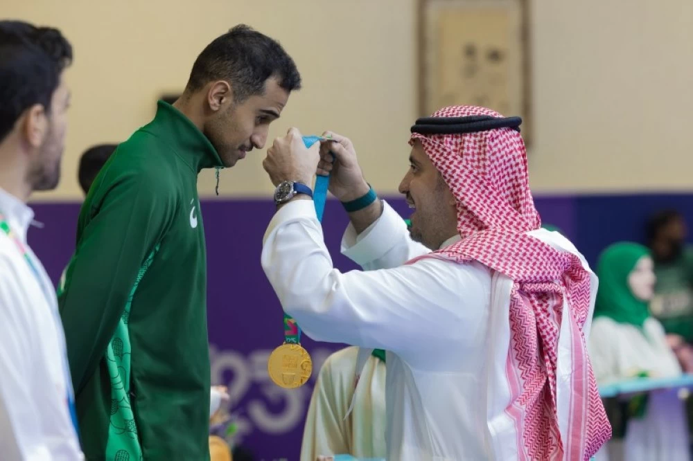 Prince Fahd bin Jiluwi bin Abdulaziz bin Musaed, Vice President of the Saudi Olympic and Paralympic Committee, awarded the gold medal to Saudi karate team player Sand Sufyani for securing first place in the over (84) kg weight category after his victory in the final against Iranian player Saleh Abazari with a score of (4 – 0).