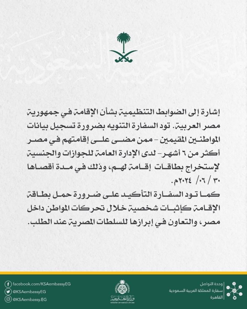 أصدرت سفارة المملكة العربية السعودية في القاهرة بياناً أشارت فيه إلى الضوابط التنظيمية بشان الإقامة في جمهورية مصر العربية، ونوهت فيه بضرورة تسجيل بيانات المواطنين المقيمين ممن مضى على إقامتهم في مصر أكثر من 6 أشهر لدى الإدارة العامة للجوازات والجنسية لاستخراج بطاقات إقامة لهم وذلك في مدة أقصاها 30/06/2024.