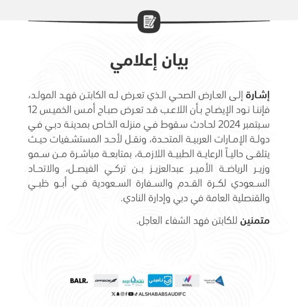 وكتب عبر البيان: «إشارة إلى العارض الصحي الذي تعرض له الكابتن فهد المولد، فإننا نود الإيضاح أن اللاعب قد تعرض صباح الخميس لحادث سقوط في منزله الخاص بمدينة دبي الإماراتية، ونقل لأحد المستشفيات حيث يتلقى حالياً الرعاية الطبية اللازمة بمتابعة مباشرة من الأمير عبد العزيز بن تركي الفيصل وزير الرياضة والاتحاد السعودي لكرة القدم، والسفارة السعودية في أبوظبي، والقنصلية العامة في دبي، وإدارة النادي».