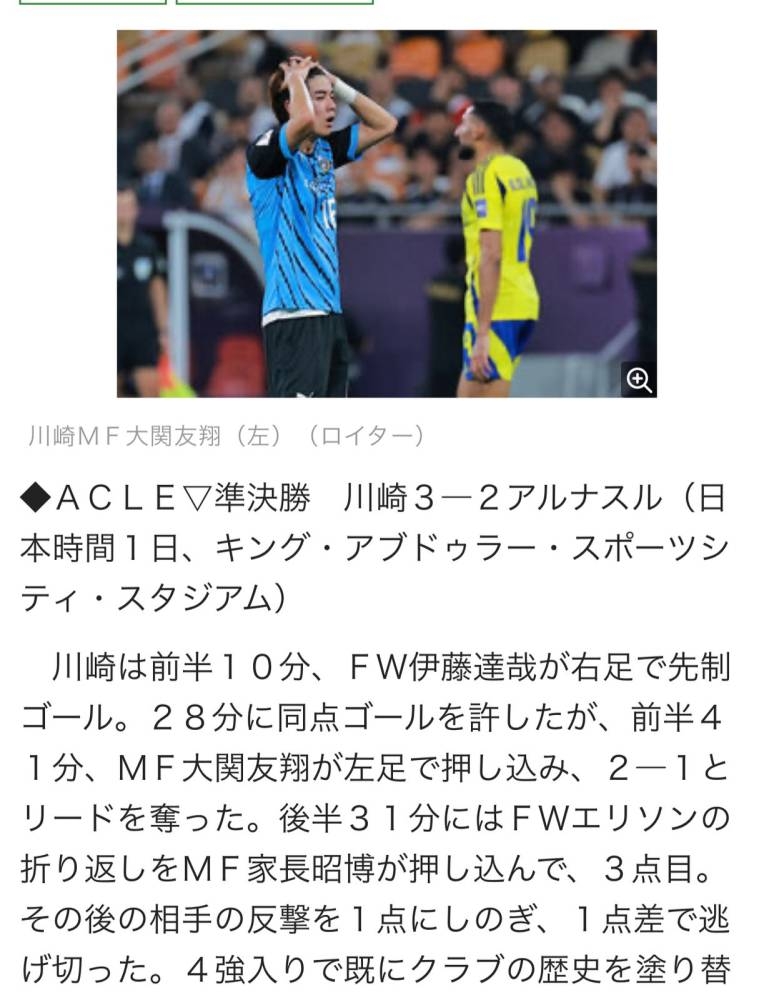 احتفت الصحافة اليابانية الصادرة اليوم (الخميس) بانتصار نادي كاواساكي فرونتال على نادي النصر السعودي بنتيجة 3-2 في نصف نهائي دوري أبطال آسيا للنخبة 2025، واعتبرت أن هذا الفوز جاء بمثابة «اختراق تاريخي» أمام فريق يضم نخبة من أبرز نجوم العالم.