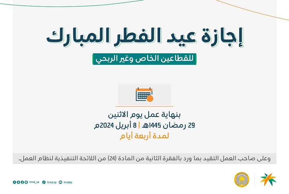 أعلنت وزارة الموارد البشرية والتنمية الاجتماعية، موعد إجازة عيد الفطر المبارك للقطاعين الخاص وغير الربحي.