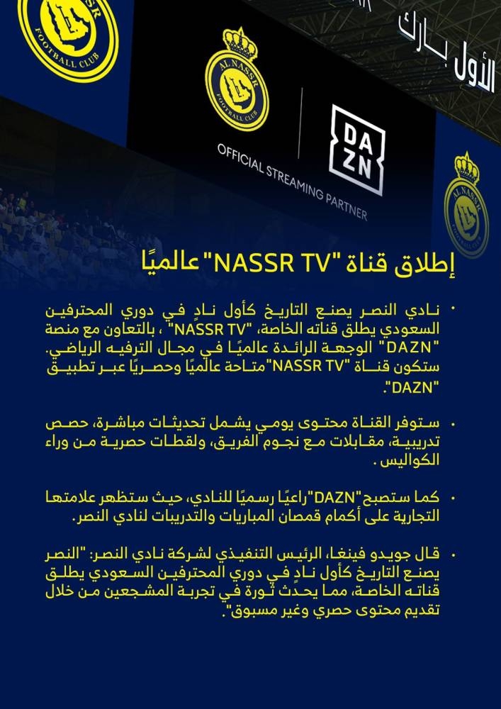 وقال النصر عبر حسابه على موقع إكس: «سعداء بالإعلان عن شراكتنا مع DAZN group»، وتابع: «أبرمنا اتفاقية استراتيجية تشمل إطلاق قناة Nassr TV الأولى من نوعها في الدوري السعودي».
