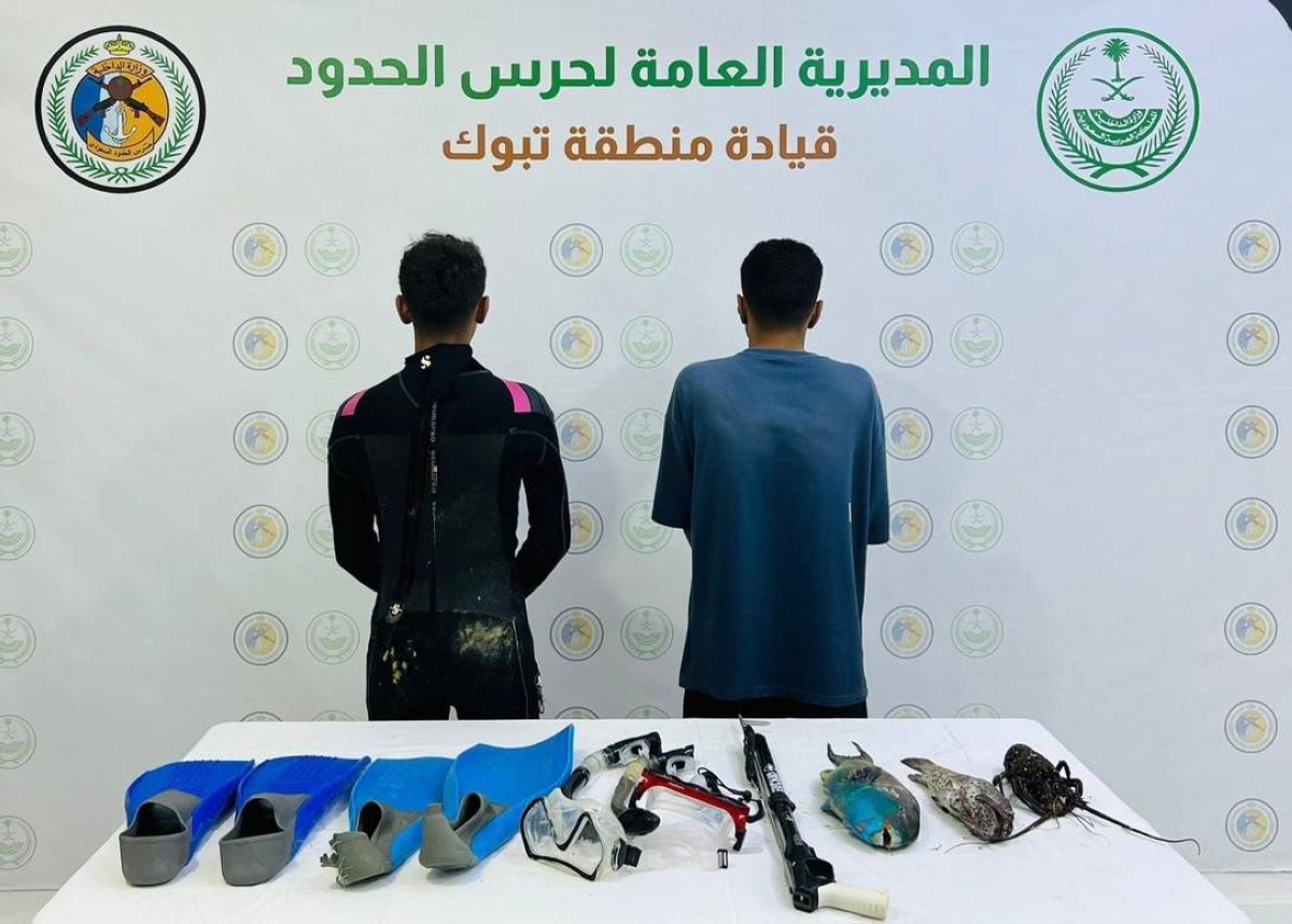 ضبطت الدوريات الساحلية لحرس الحدود في حقل بمنطقة تبوك مواطنين مخالفين للائحة الأمن والسلامة لمزاولي الأنشطة البحرية في المناطق البحرية للمملكة العربية السعودية، وذلك لممارستهما الصيد دون تصريح، وبحوزتهما أسماك مصيدة، واتخذت الإجراءات النظامية بحقهما بالتنسيق مع الجهات المختصة.