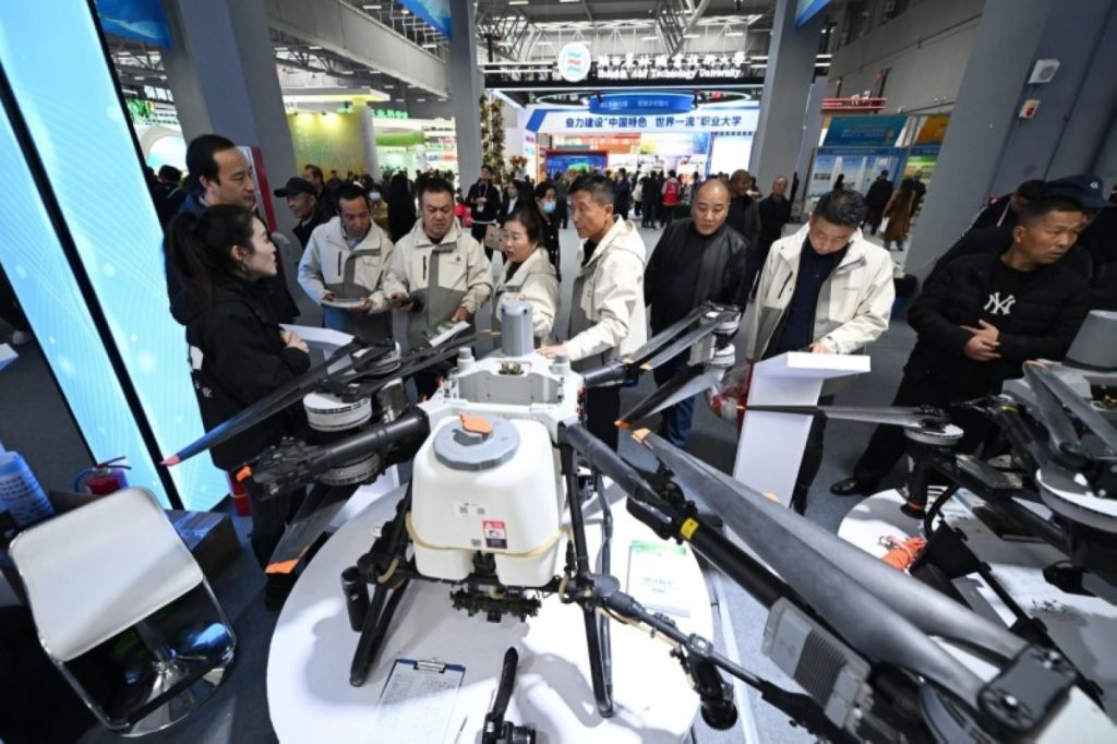 شهدت مدينة يانغلينغ بمقاطعة شنشي شمال غرب الصين، عرض ابتكارات في مجال التكنولوجيا الزراعية العالية، وذلك بأحد المعارض المتخصصة. وفي الصورة متعاملون يستعرضون طائرة درون لرش المبيدات. (إيكونومي دايلي الصينية).
