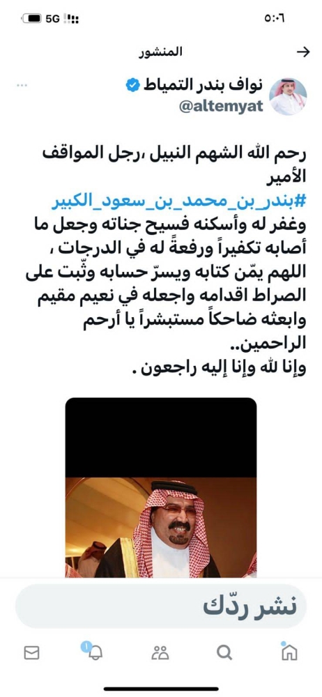 وكتب لاعب الهلال السابق الليبي طارق التايب: «لا حول ولا قوة إلا بالله. اللهم اغفر للأمير بندر بن محمد وارحمه وأدخله الجنة»، وقال فيصل أبو اثنين: «اللهم إن عبدك بندر بن محمد في ذمتك وحبل جوارك، اللهم اغفر له وارحمه، وتجاوز عنه، وأعظم أجره، وأتمم نوره، وأفسح له في قبره، إنك أنت الغفور الرحيم، اللهم ارفع درجته في المهديين، واخلفه في تركته في الغابرين، اللهم لا تحرمنا أجره، ولا تضلنا بعده، واجعل الجنة مستقره وجميع المسلمين».