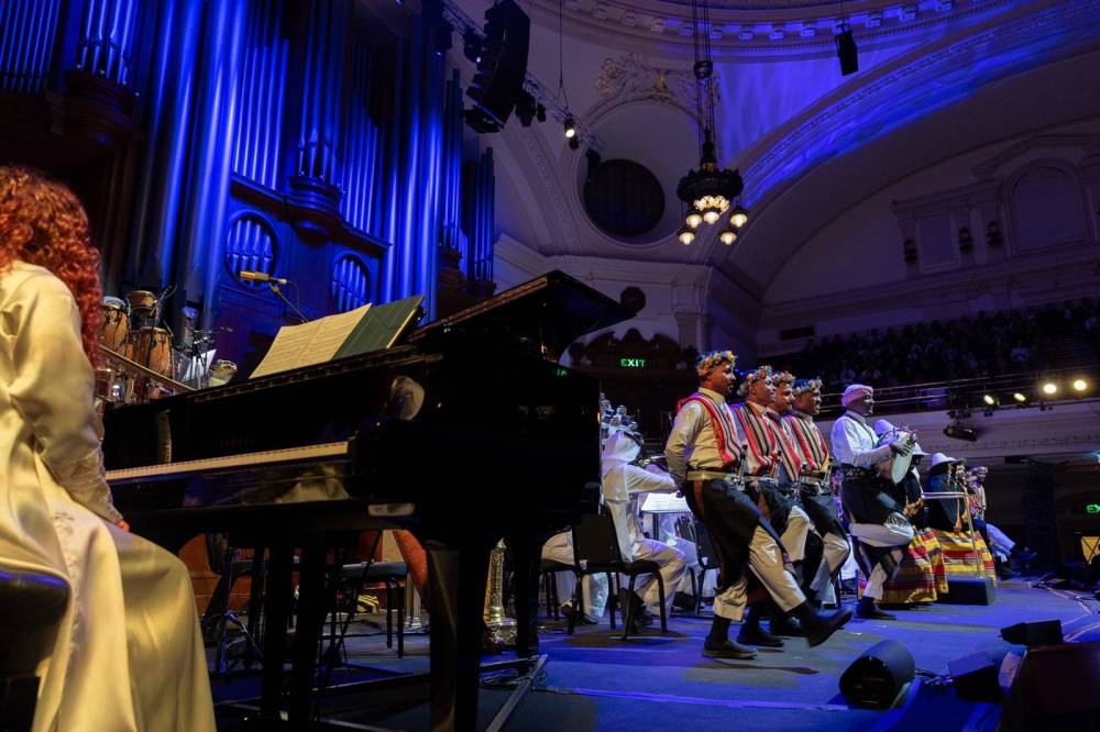 وتجسيداً للإبداعات الشعرية التي قدمها الشاعر الراحل الأمير بدر بن عبدالمحسن -رحمه الله- كانت البداية بتكريم لمشواره الثقافي الكبير الذي قدم من خلاله العديد من الأعمال الشعرية التي أثرت الساحة الثقافية بمكنون شعري مميز ومثرٍ، حيث بدأت فرقة الأوركسترا والكورال الوطني السعودي الحفل بأغنية «أنا من هالأرض»، التي كتبها الأمير الراحل بدر بن عبدالمحسن، وغناها الفنان محمد عبده، ولحنها الفنان الدكتور عبدالرب إدريس. وتعزيزاً لحضور الفنون السعودية على الساحة العالمية، شاركت هيئة المسرح والفنون الأدائية بـ 3 فنون صاحبت أغنيات سعودية شهيرة، جسدت في بعض الأعمال الفنية ونقلها بصورة ثقافية تعكس الموروث الثقافي السعودي، حيث قدم الفن السامري على أنغام وموسيقى «اسمحي لي يا الغرام» للفنان محمد عبده، وشارك الفن الينبعاوي في أغنية «حنا طلبنا الله» المستوحاة من الفن التراثي السعودي، وفن الربش بأغنية «سعوديين». وأنهت الأوركسترا والكورال الوطني السعودي الفقرة الأولى من الحفل بأداء لأغنية «Roling in the Deep» الشهيرة للنجمة البريطانية «أديل» باللون السعودي، كما استفتحت الفقرة التالية بأداء للأوركسترا الملكية الفلهارمونية البريطانية، و“RSVP Voices” بقيادة المايسترو البريطاني بينجامين بوب، ومغنية الأوبرا سارة كونولي، حيث بدأت الفرقة البريطانية فقرتها بأغنية Walton للتاج الإمبراطوري. وبتعاون يمزج موسيقى وثقافة حضارتين، اختتم الحفل بأداء مشترك للأوركسترا السعودية مع الأوركسترا الفلهارمونية الملكية البريطانية بقيادة المايسترو السعودي هاني فرحات، عبر عدد من الأعمال الموسيقية بتأليف محمد عشي، ورامي باصحيح.