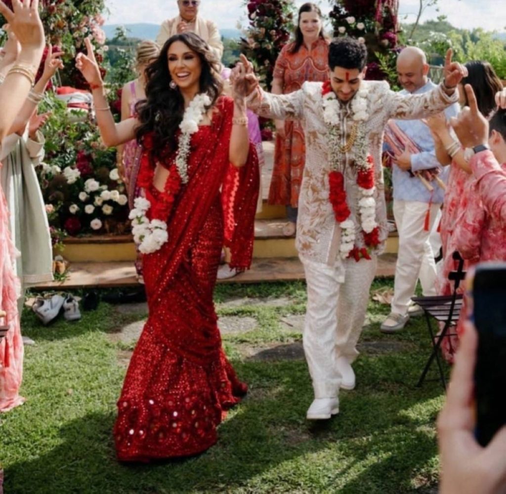 الاحتفالات انطلقت بعشاء ترحيبي على الطراز الإيطالي التقليدي في حديقة مفتوحة، تزينت بالموسيقى الهادئة، وتألقت العروس بـ«ساري» أحمر مطرز خصيصاً، نسقته مع حذاء فضي ومجوهرات ماسية لافتة. وشارك العريس صوراً من الحفل عبر حسابه على «إنستغرام»، وعلق قائلاً: «حفل زفاف أحلامنا، على الطريقة الهندية».