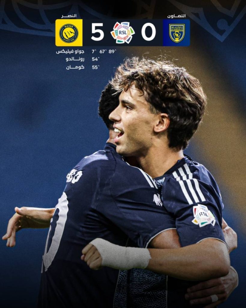 وأحرز أهداف النصر الخمسة كل من: جواو فيليكس (هاتريك 7، 67، 89)، كريستيانو رونالدو (من ركلة جزاء 54)، كينغسلي كومان (د: 55).