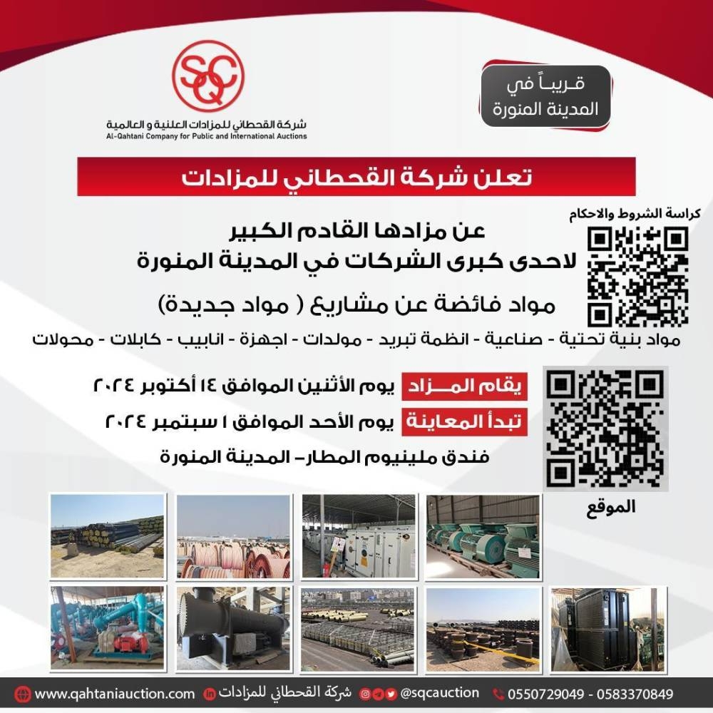 شركة القحطاني للمزادات تعلن عن مزادها القادم لإحدى كبرى الشركات في المدينة المنورة