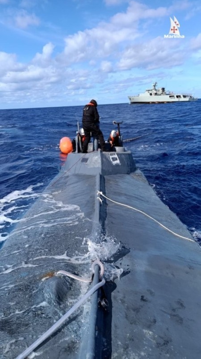 ووفقا لفيديوهات نشرتها السلطات، حاصرت سفينة برتغالية الغواصة، وصعدت فرق الشرطة والبحرية إليها لمصادرة الشحنة واعتقال الطاقم.