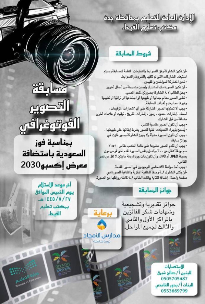 يشارك طلاب وطالبات مكتب تعليم الفيحاء التابع للإدارة العامة للتعليم بمحافظة جدة في المسابقة الفوتوغرافية التي أطلقتها شعبة التربية الفنية ووحدة الإعلام والاتصال بالمكتب لجميع المراحل الدراسية لمدارس المكتب بنين وبنات.