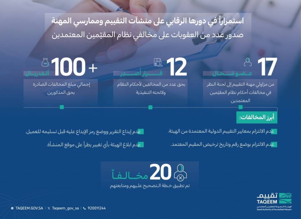 وتؤكد الهيئة في إطار سعيها للقيام بدورها في الرقابة وضبط المخالفات، ضرورة التقيُّد بالأنظمة واللوائح المنظمة لمهنة التقييم، حرصاً على ضمان ممارسة المهنة بشكل نظامي وصحيح، وإيقاف الممارسات التي تؤثر سلباً على المهنة وممارسيها وتضمن حقوق المستفيدين منها، كما تُهيب بالإبلاغ عن أي مخالفة لنظام المقيّمين المعتمدين والأحكام والقواعد المنظمة لمهنة التقييم من خلال التواصل عبر قنوات الهيئة الرسمية.