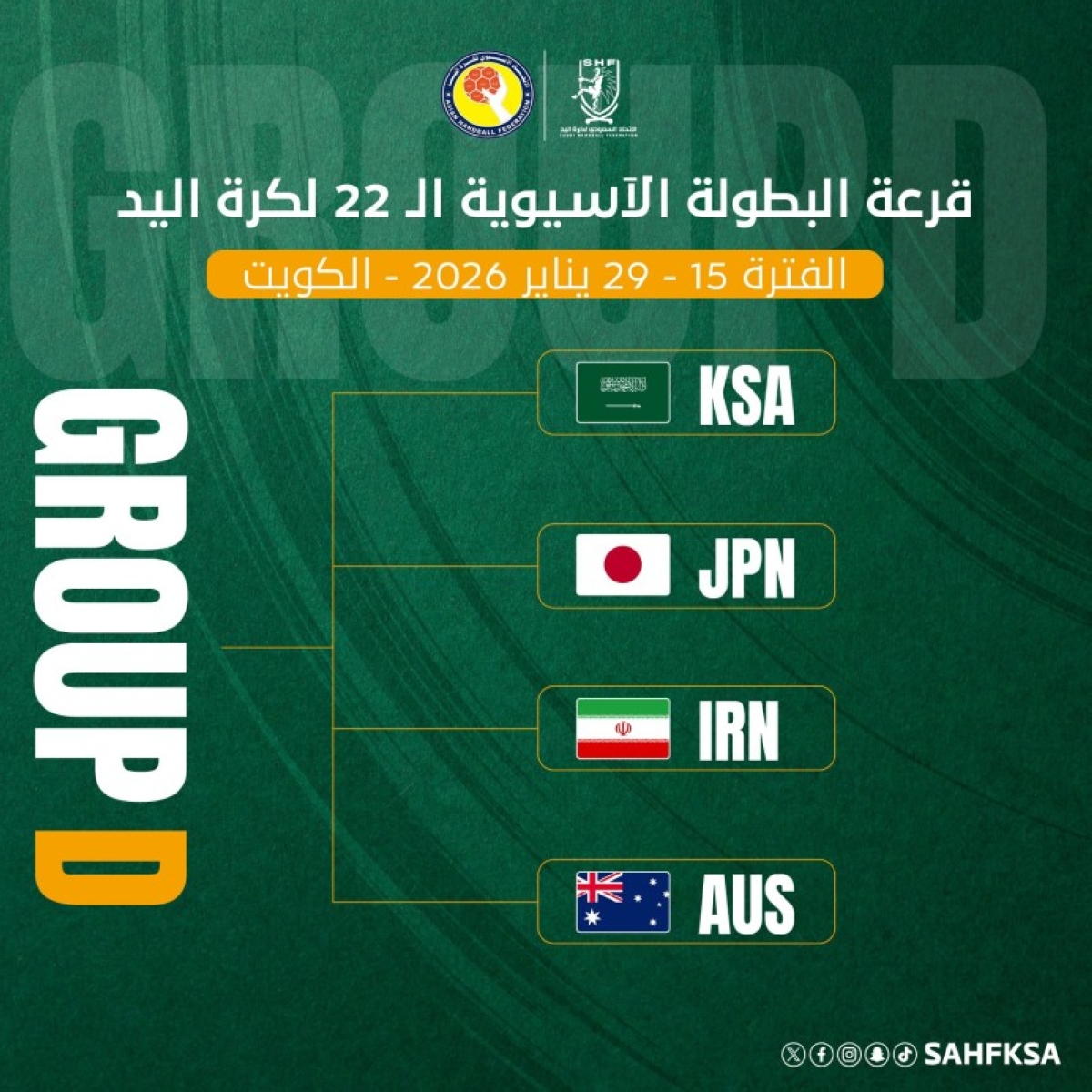 أسفرت قرعة البطولة الآسيوية الثانية والعشرين لكرة اليد للرجال، والمؤهلة إلى كأس العالم 2027، عن وقوع المنتخب السعودي في المجموعة (D) إلى جانب منتخبات اليابان وإيران وأستراليا، وذلك خلال القرعة التي سحبت في الكويت، بحضور ممثلي الاتحاد الآسيوي لكرة اليد، وممثلي المنتخبات المشاركة.