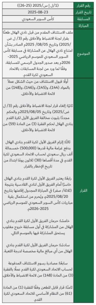 أربك قرار لجنة الاستئناف بالاتحاد السعودي لكرة القدم، الصادر ضد نادي الهلال بشأن امتناع نادي الهلال عن المشاركة في مسابقة كأس السوبر السعودي للموسم الرياضي 2025-2026، الوسط الرياضي، بعد قبول استئنافه شكلاً، وإلزام النادي بدفع غرامة قدرها 500 ألف، واعتباره خاسراً أمام القادسية بنتيجة 3/0، والحرمان من المشاركة بأول مسابقة خروج مغلوب، وكذلك حرمانه من أي مخصصات مالية لدرجة اللعبة، ومصادرة رسوم الاستئناف. جاء ذلك قبل ساعات من انطلاق نهائي السوبر الذي يجمع النصر والأهلي بعد تأهلهما على حساب الاتحاد والقادسية، إذ كشف القرار خللاً واضحاً في أنظمة ولوائح اتحاد القدم التي تحتاج لإعادة صياغتها بما يتواكب مع المرحلة الحالية التي تعيشها الرياضة السعودية.