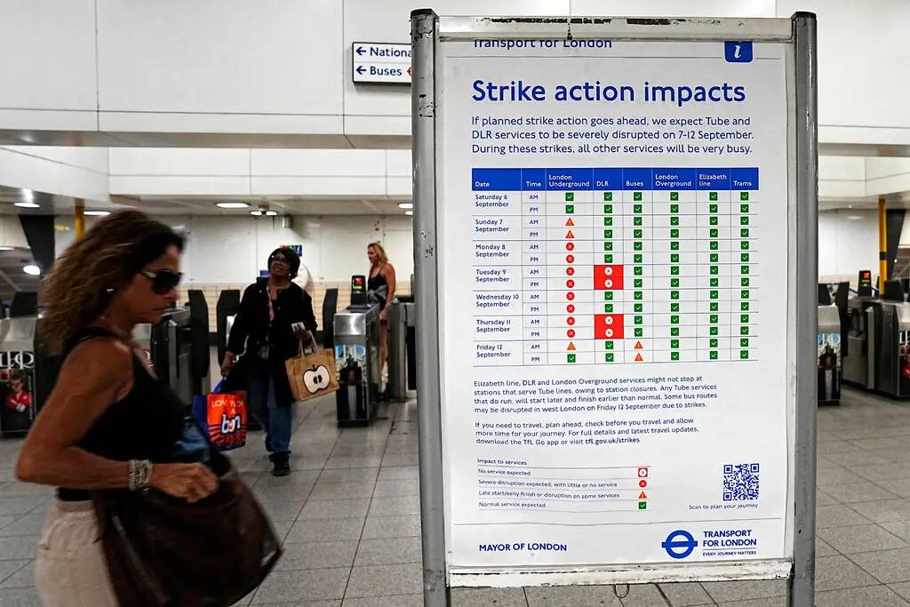 حذرت هيئة النقل في لندن (Transport for London) من أن خدمات المترو ستكون «قليلة أو معدومة» من الإثنين حتى الخميس، بعد أن شهدت أمس (الأحد) أول أيام الإضراب المحدودة. ويستخدم نحو خمسة ملايين راكب المترو يومياً، الذي يضم 272 محطة و11 خطاً في أنحاء لندن وضواحيها.