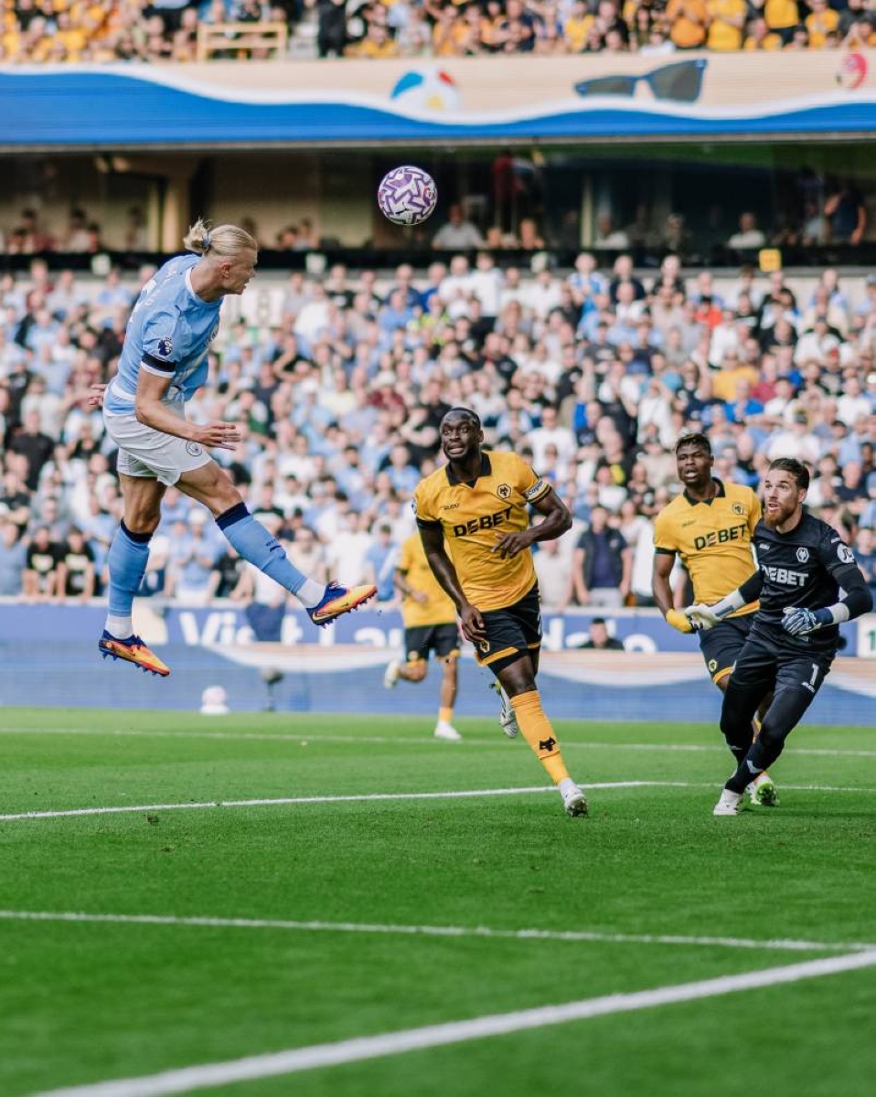 على ملعب مولينيو، افتتح مانشستر سيتي مشواره بفوز قوي ومستحق على مضيفه وولفر هامبتون برباعية نظيفة، وشهد اللقاء سيطرة مبكرة للسيتي وتمكن من إحراز أول الأهداف بعد كرة عرضية أرضية من ريكو لويس ليضعها المهاجم إيرلينغ هالاند في الشباك (د:34)، وبعد مرور ثلاث دقائق فقط أضاف السيتي الهدف الثاني عن طريق تيجاني ريندرز الذي سدد كرة أرضية على يمين الحارس جوزيه سا (د:37)، وفي الشوط الثاني أضاف مانشستر سيتي هدفين عن طريق إيرلينغ هالاند (د:61) وريان شرقي (د:81)، لينتهي اللقاء لمصلحة السيتي برباعية نظيفة.