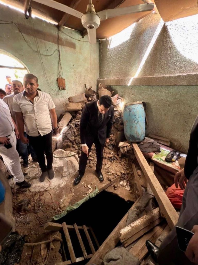 وكشفت النيابة أن الحفرة تنتهي بسرداب أفقي طوله ستة أمتار يمتد أسفل غرف المكتب، فضلًا عن كميات كبيرة من مخلفات الحفر، وأدوات وألواح خشبية يُشتبه في استخدامها للتنقيب عن الآثار.