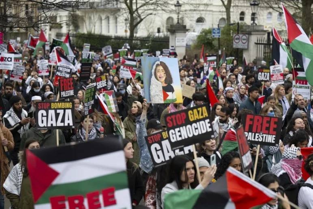 وحمل المتظاهرون لافتة كبيرة كتب عليها «الحرية لفلسطين»، إضافة إلى «سلام لفلسطين» و«لا تتجاهلوا معاناة الفلسطينيين»، كما هتف المتظاهرون «من النهر إلى البحر، فلسطين ستكون حرّة»، و«ليست حرباً بل إبادة».